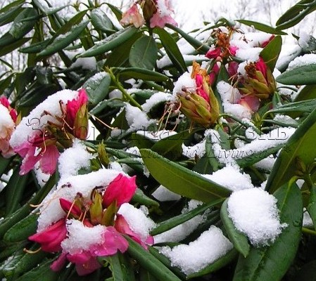 На фото ниже: Рододендрон зимнецветущий в палисаднике у моих соседей (бывший сад Грэхэма Томаса). Этот прекрасный рододендрон отлично виден из наших окон. Его ярко-розовые цветы очень радуют в серый ненастный зимний день. У нас в саду несколько рододендронов, но все они цветут весной. По середине: красные ягоды пираканты под январским снегом. Фото справа - наша цветущая камелия под снегом. Редкий февральский снегопад застал расцветшую камелию врасплох! См. также: Цветы в снегу на юге Англии.